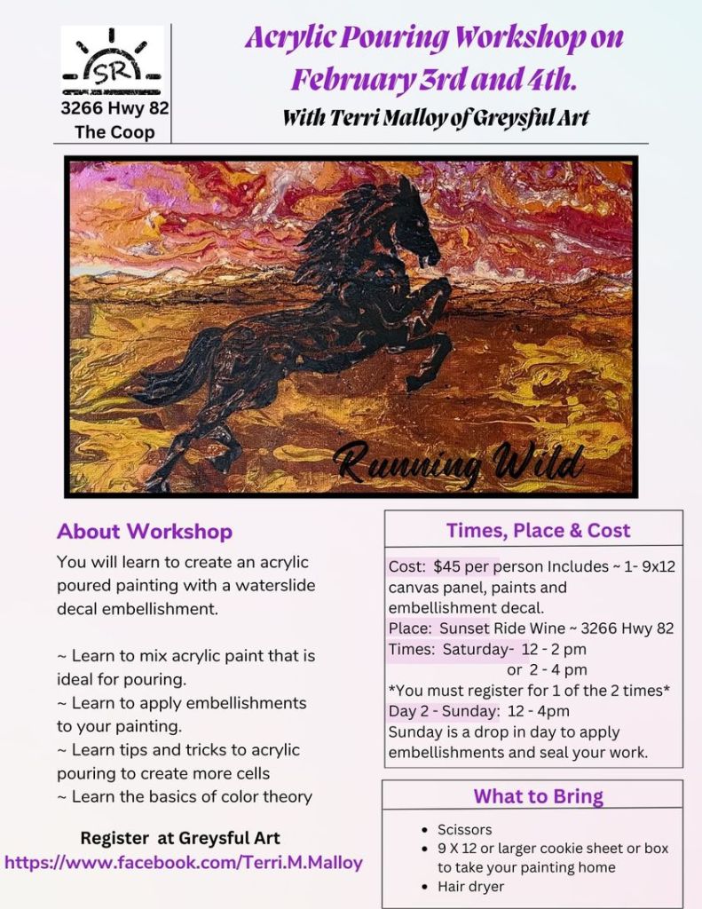 Feb. 3 & 4: Acrylic Pouring Workshop at the Coop 3266 Hwy 82 The Coop. Click here to see event flyer.