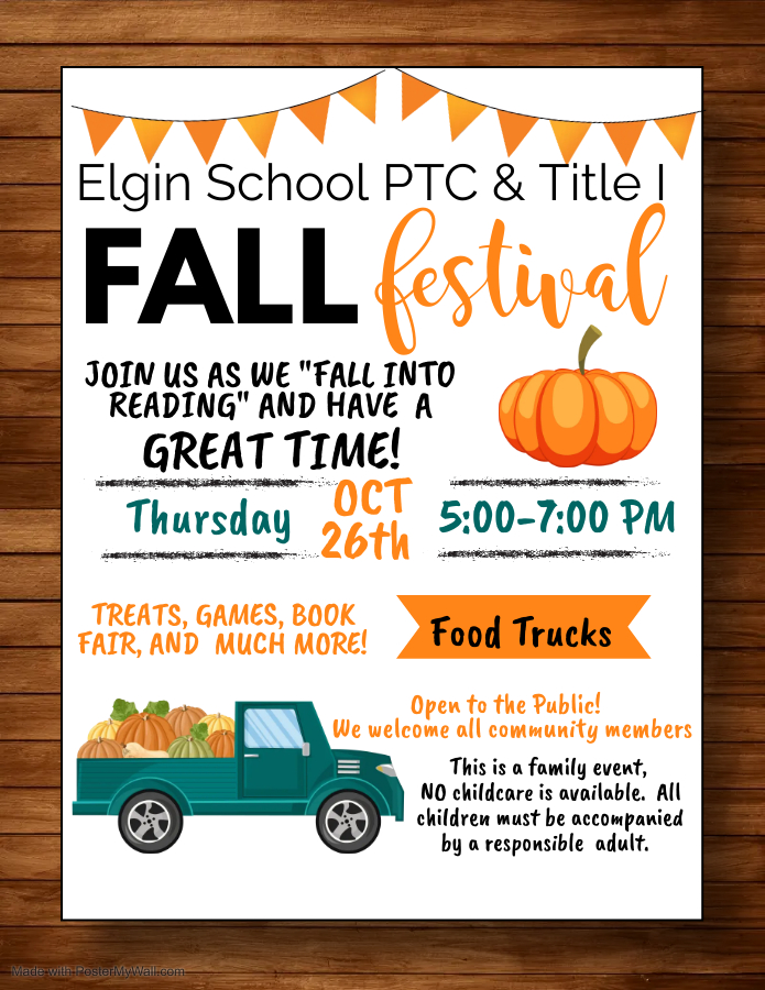 Oct. 26: 5 – 7pm. Elgin PTC Fall Festival Event! Click here to see event poster.